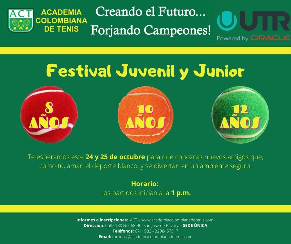 Un mundo de colores, raquetas, alegría y sana competencia se sentirá este sábado 24 y domingo 25 de octubre en la sede de la Academia Colombiana de Tenis, gracias al Festival Juvenil y Junior de Tenis que se programó para tener un fin de semana diferente y retomar la práctica deportiva.